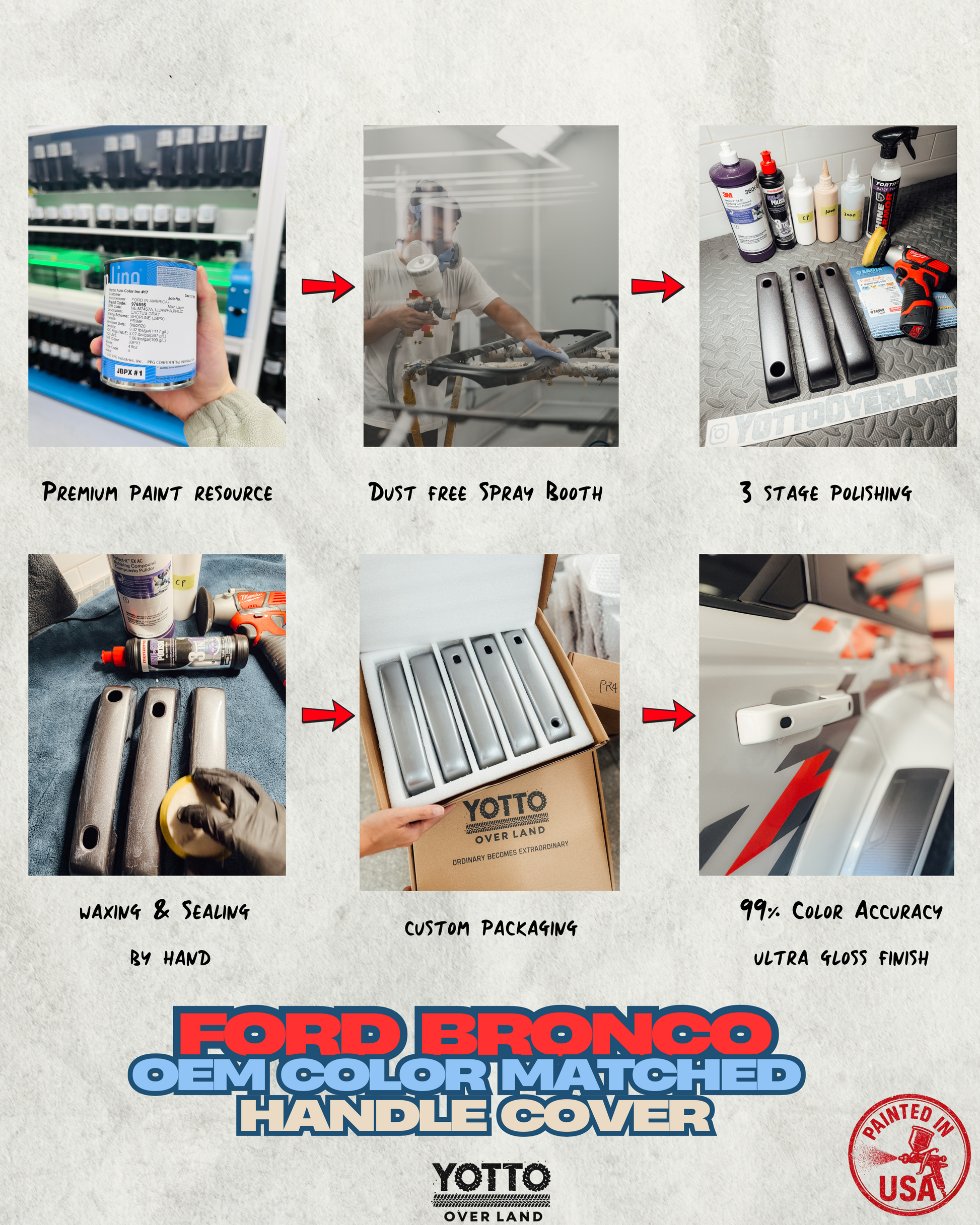 This is our very first refinished product for the Bronco community. Since it’s a part you’ll be touching every day, we chose OEM-grade paint materials and Euro Grade clear coat to ensure long-lasting durability. It’s a small upgrade that our Bronco owners can genuinely feel proud of.