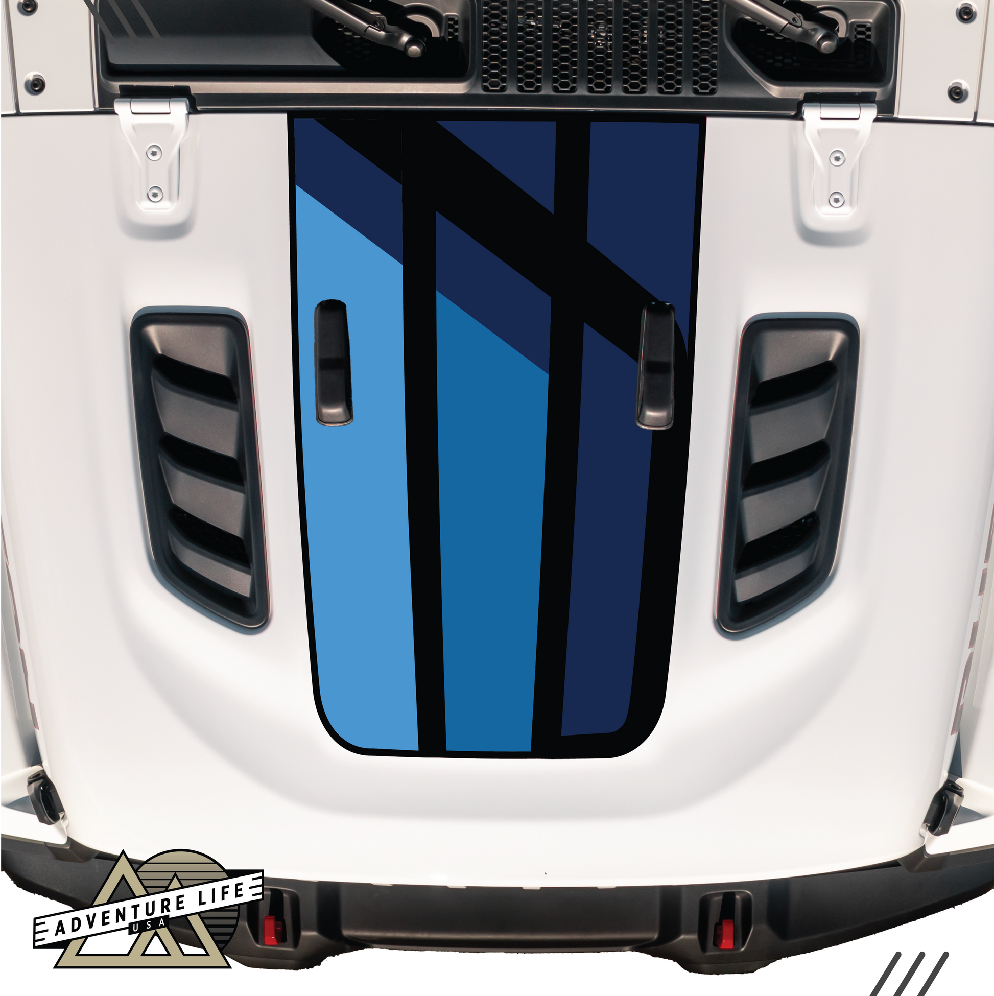 Add a bold retro vibe to your Rubicon with the Retro Blue Stripe Hood Graphic – 4-Color Fade Edition, inspired by the J6 Honcho concept vehicle featured at Easter Jeep Safari. This custom design features four stacked shades of blue in a clean stripe layout — a modern tribute to the iconic styling of vintage Jeep trucks.