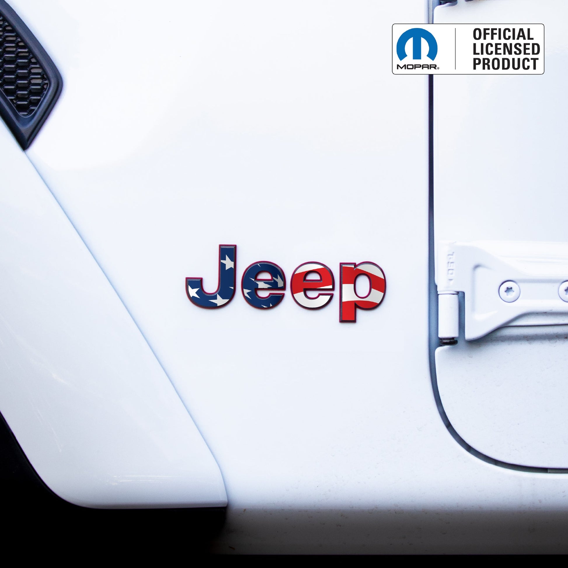 Show your pride and customize your Jeep Wrangler with an official Mopar licensed “Jeep” emblem overlay decal set. These are vinyl decal stickers designed to apply directly over your existing Jeep emblems — not replacement or 3D badges. Made from premium automotive vinyl, this set features American Flag-inspired designs that give your Wrangler a bold, patriotic accent while keeping a clean, factory-quality finish.